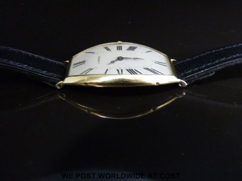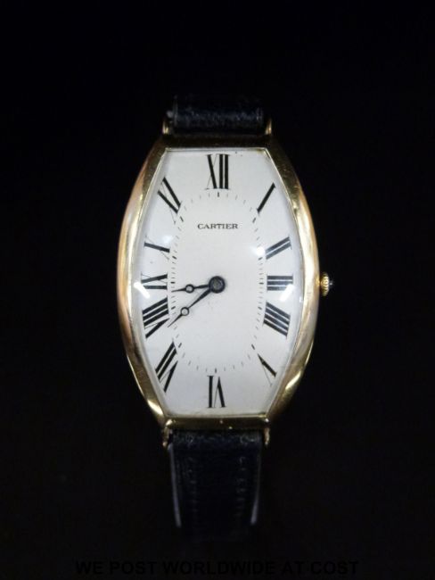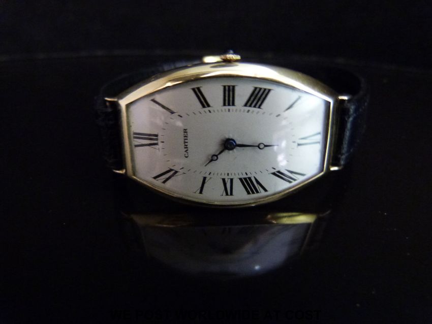 Cartier 18ct gold tonneau shaped curved wristwatch with blued Breguet hands, Roman numerals, champagne face and sapphire set crown, on black leather strap, 18 jewel movement signed Cartier Paris and numbered 10603 4, c1920, case size 40x26mm.