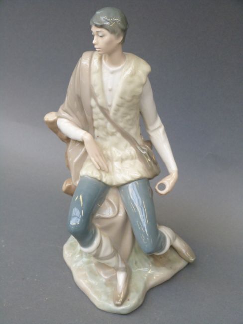 A Lladro figure sitting on a tree stump