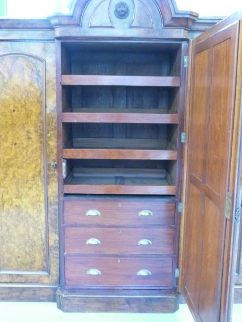 A 19thC breakfront burr walnut wardrobe or compactum, the central mirror door opening to reveal four linen press drawers and three further drawers, flanked by hanging space behind each side door, W210 x D68 x H227cm