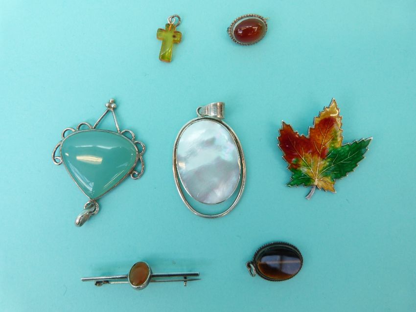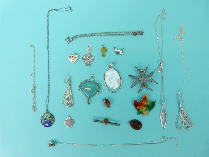A collection of silver jewellery to include heart lockets, pendant set with pressed amber, a dyed quartz pendant, other silver pendants and chains etc