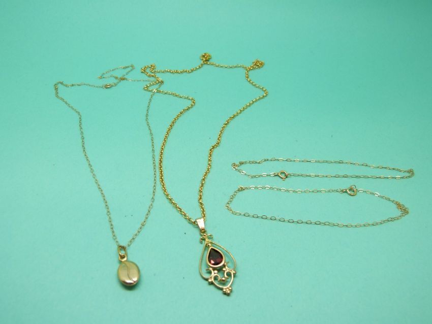 Two 9ct gold necklaces, one with a coffee bean pendant together with two 9ct gold bracelets, weight 3.2g