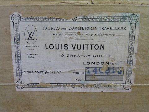 A Louis Vuitton ash and metal bound trunk with steel rollers, twin handles and lift out tray. Original Louis Vuitton "Trunks for Commercial Travellers, London" label with serial no 149813, the number repeated in ink to the trunk lining, W75 x D45 x H104cm