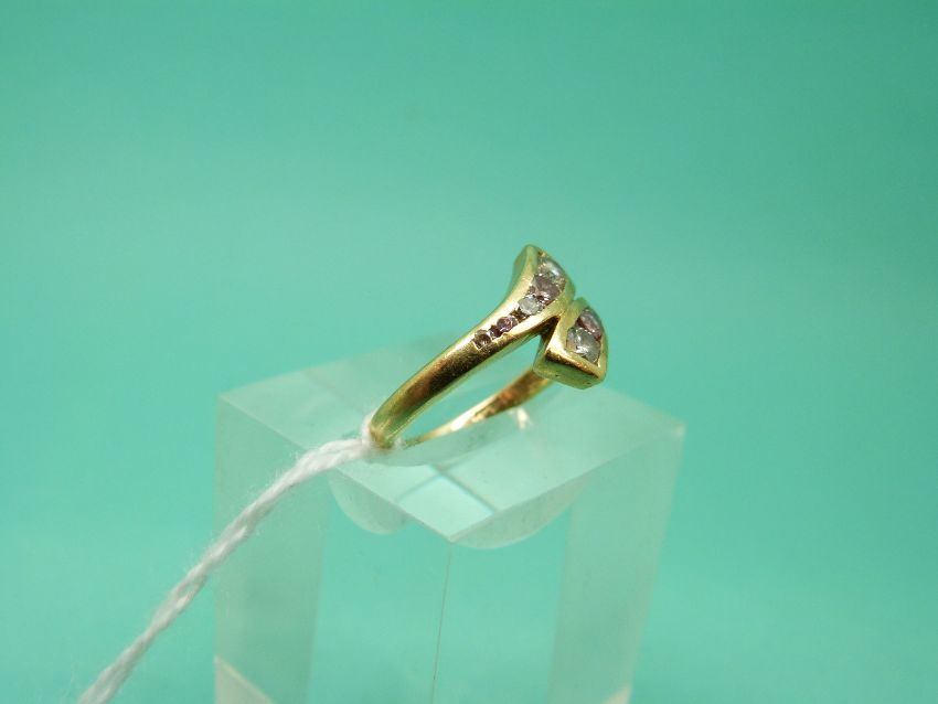 An 18ct gold ring set with two sets of graduating pink and colourless round brilliant cut diamonds in a crossover design, by Kutchinsky (Size I)