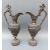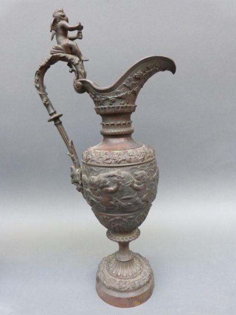 A pair of bronze neoclassical style urns with cherubs to handles, height 57cm