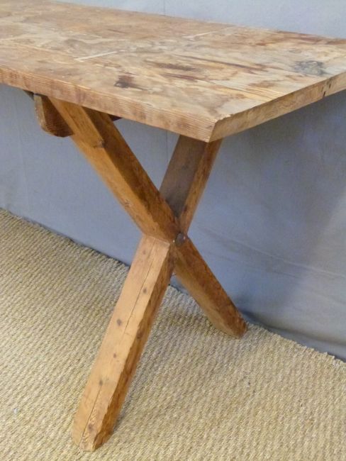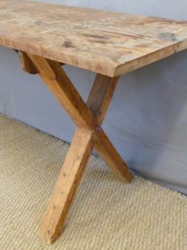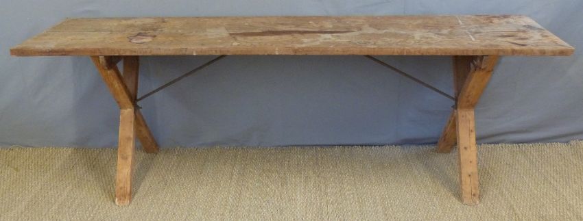 A pitch pine tavern table with steel stretchers, H80 x L240 x W57cm)