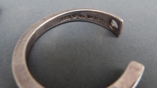 A pair of modern Swedish white metal napkin rings, with Swedish silver marks for 1963, maker's mark SEH and also H & Co, weight 51g together with a continental white metal ashtray marked 830S