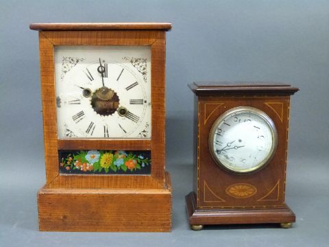 A late 19th century American 'postman's clock' together with a c1900 mahogany cased mantel clock with inlaid shell decoration