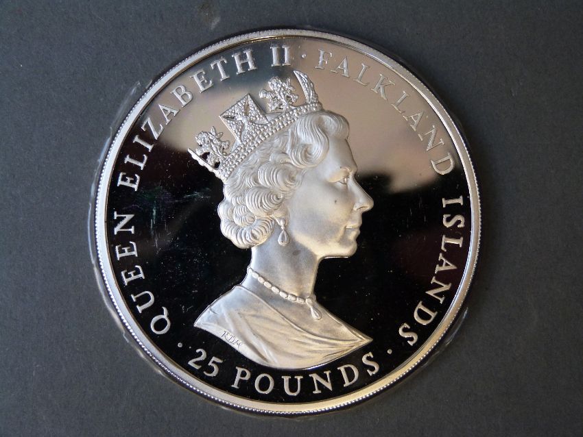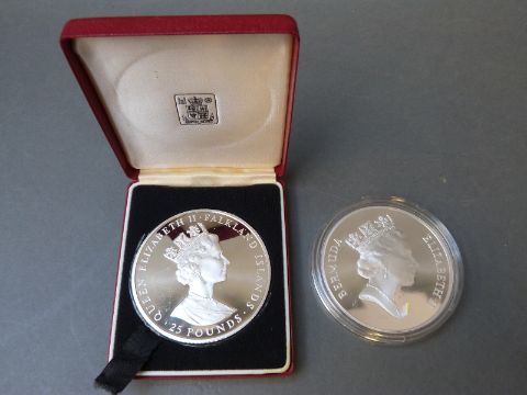 A cased silver Falkland Island giant coin 165g, cased but no certificate, together with an uncased silver Bermuda 5 dollars, 185g