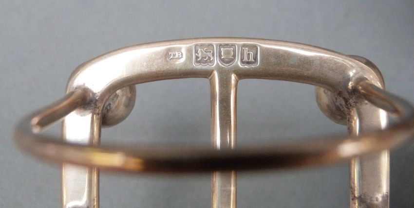 A boxed hallmarked silver photograph frame to suit approx 6 x 4" photo, a hallmarked silver four slice toast rack London 1903, maker Thomas Bradbury & Sons, weight 160g, length 11.5cm and a white metal mounted horn napkin ring