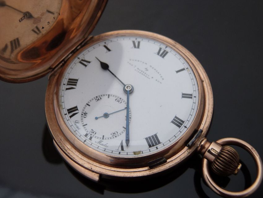 Thomas Russell & Son of Liverpool 9ct gold quarter repeater full hunter keyless wind pocket watch with Roman numerals, subsidiary seconds dial, blued hands and white enamel face, case diameter 55mm, 111g.