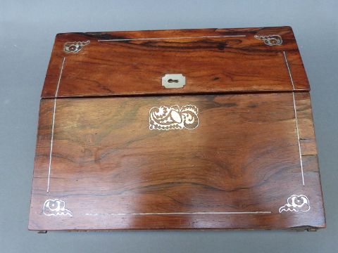 A 19thC inlaid walnut dome top two division tea caddy, width 20.5cm and a mother of pearl rosewood writing slope, width 30.5cm
