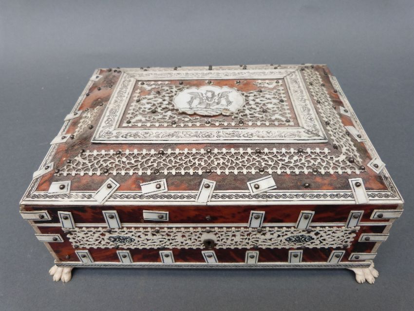 A Vizagapatam jewellery box raised on lions claw feet, width 22cm