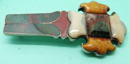 A Victorian banded agate brooch and a silver Victorian cross brooch set with agate sections.