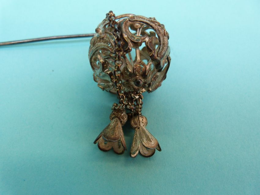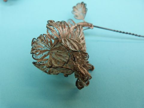 A pair of white metal filigree stick pins in the form of flowers with spring sections and a pair of white metal continental stick pins with pierced floral decoration