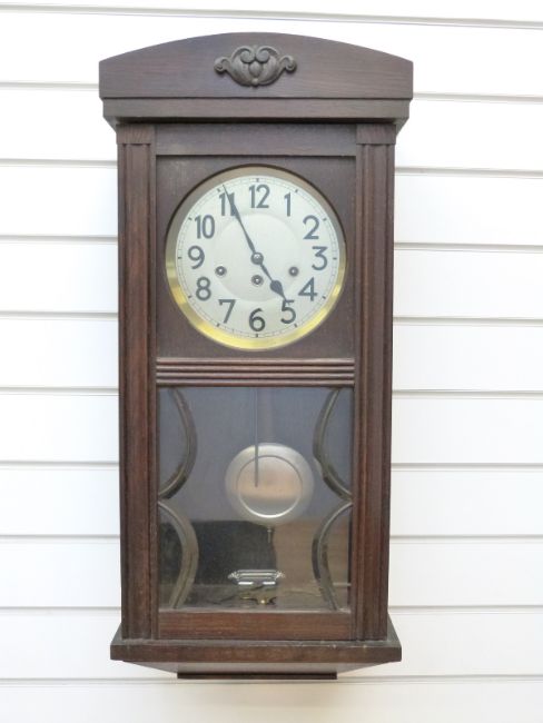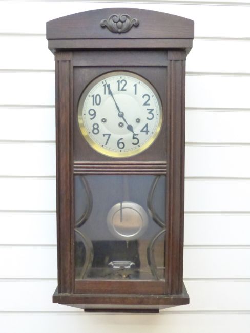 An oak cased wall clock with three train movement, bold Arabic numerals on metal dial