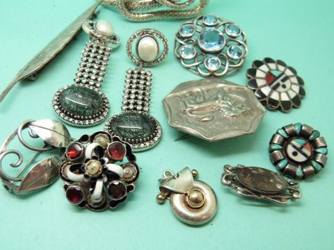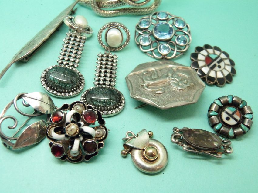 A silver Arts and Crafts brooch, Austro-Hungarian brooch, quartz, pearl and cubic zirconia earrings, silver snake bracelet set with blue topaz etc