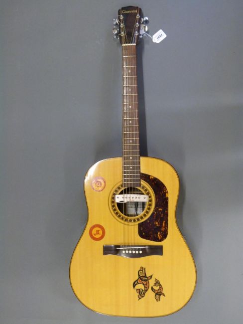 Giannini Brazilian acoustic guitar with six steel strings on individual tuning pegs and retro fitted with Shadow pick-up, in a hard carry case