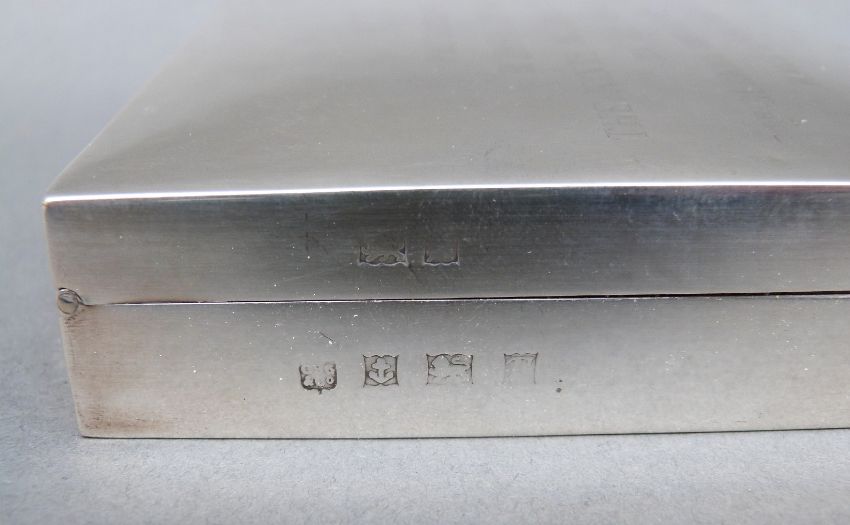 A hallmarked silver cigarette case 'presented to RQMS W.K Eyre, the King's Own Royal Regiment by 7th Gurkha Rifles, Hong Kong 1954-57', width 11cm, and a hallmarked stud dated 1916