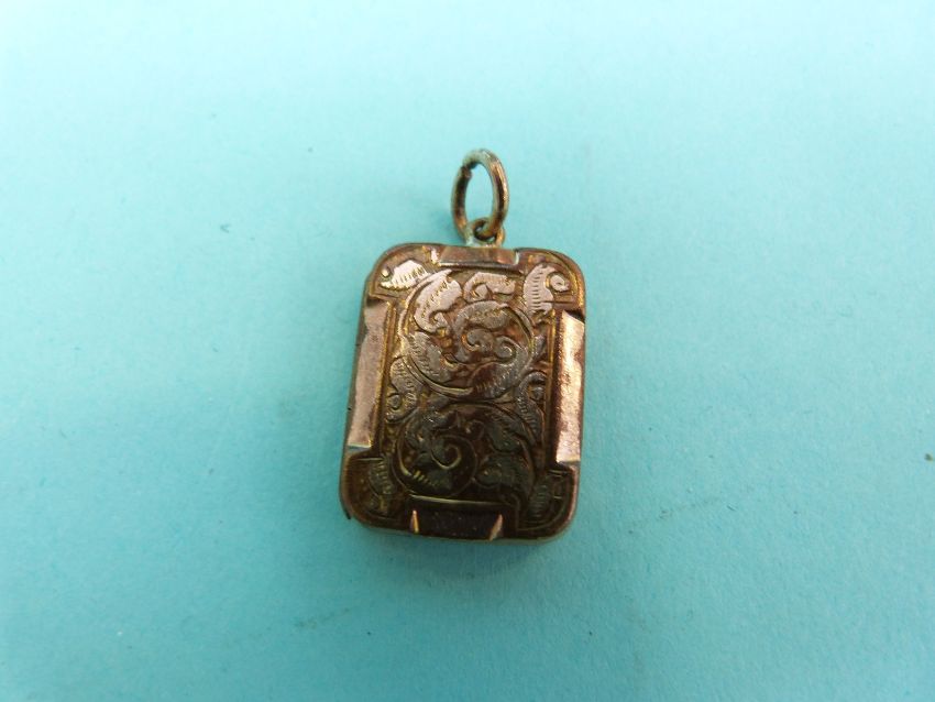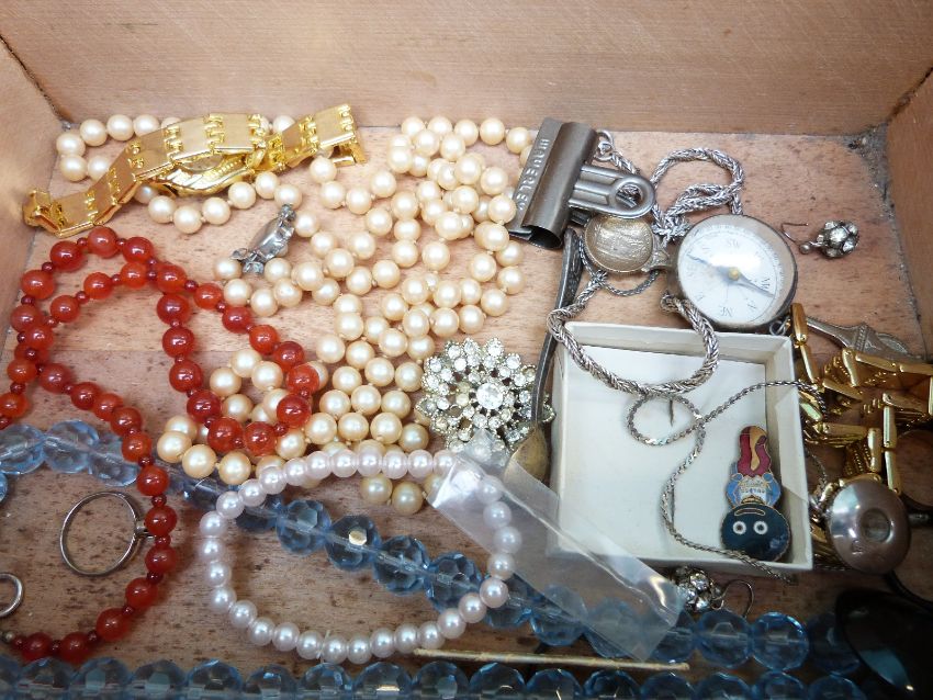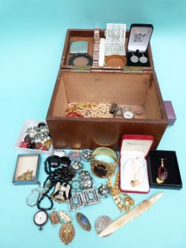 A collection of costume jewellery to include a fob watch, early plastic buttons, brooches, compact, silver necklace, rolled gold bangle, jet beads, carnelian agate, military badge, Masonic medallion, yellow metal chain etc