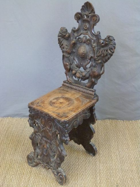 An oak hall chair carved with lions and mythical creatures, height 114cm