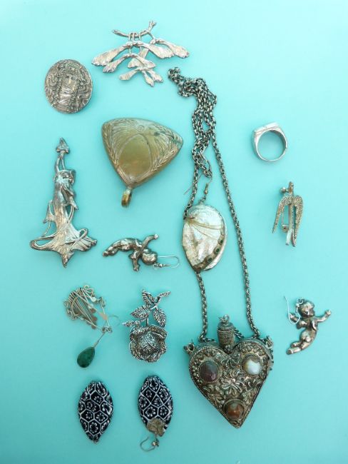 A brooch marked Keim Ltd London, white metal brooches, Art Nouveau jewellery, amber bracelet, perfume bottle on chain etc