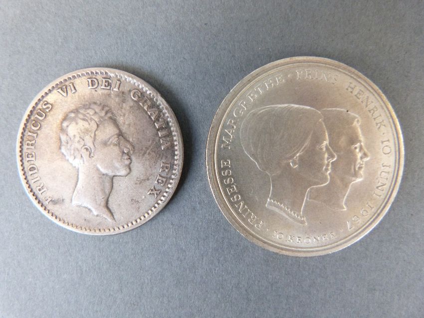 Denmark 1st year type Rigsbankdaler 1813 together with a Danish Royal Wedding 1967 10 Kr with 'coincraft' documents