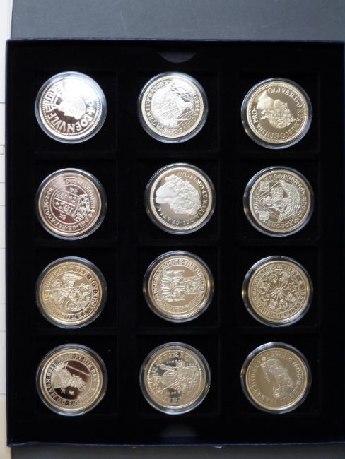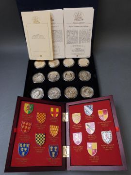 A cased set of "Historic Coins of Great Britain" comprising twelve 38.61mm silver coins with 22ct gold plating, each 20g weight, with certificates, together with a cased set of Kings and Queens of Great Britain enamelled badges/coats of arms