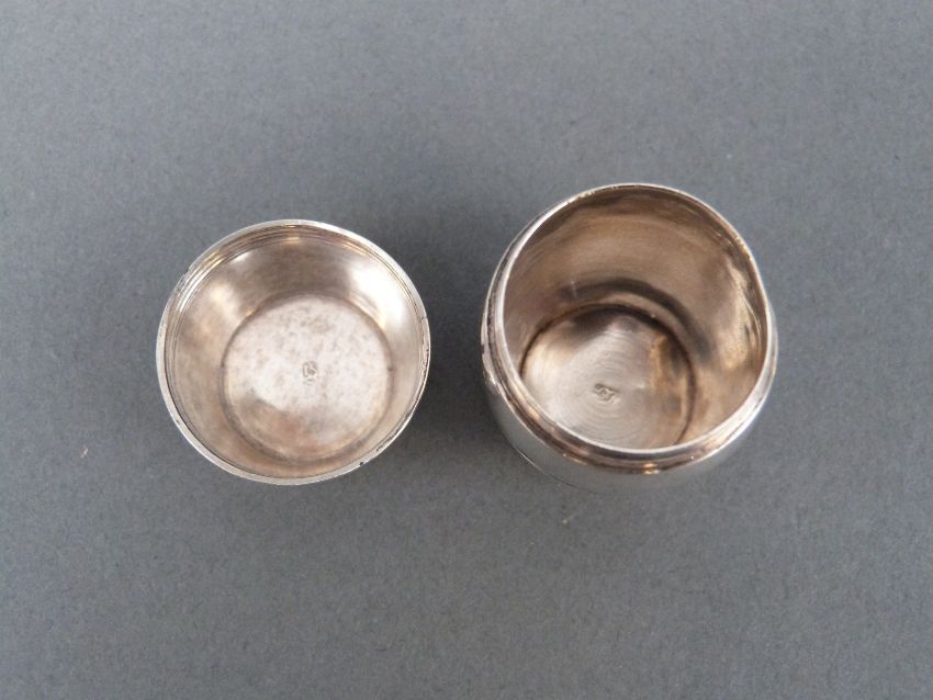 A mid 18thC silver novelty barrel shaped container with screw lid, marked only with the maker's mark DF to each end, weight 11g, length 32mm