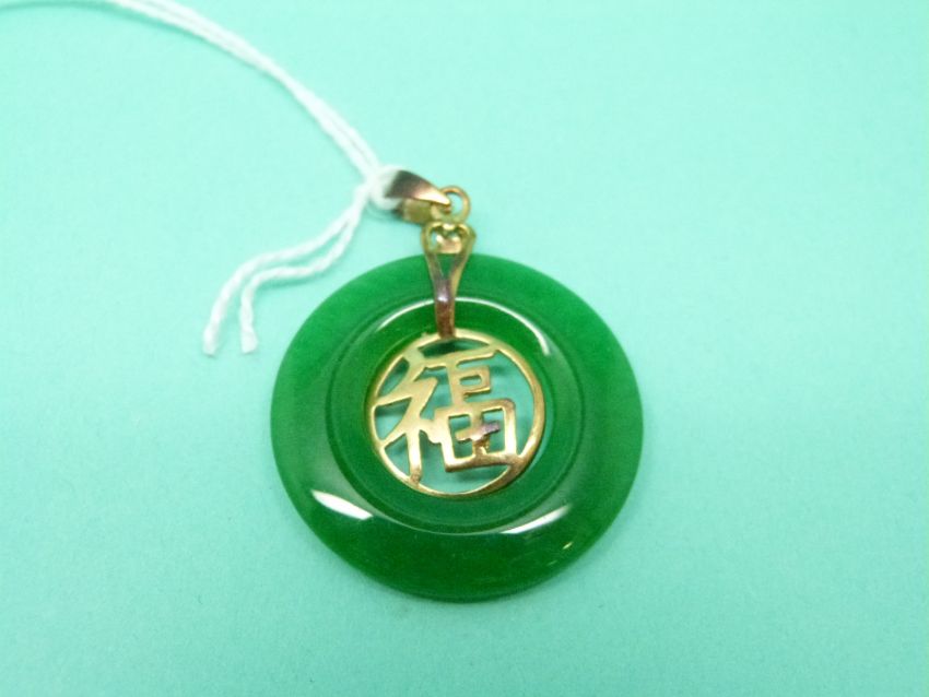 A jadeite pendant in the form of a disc with 18ct gold mount and Chinese characters to the centre