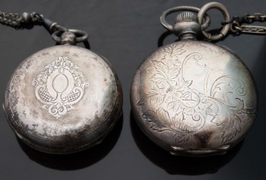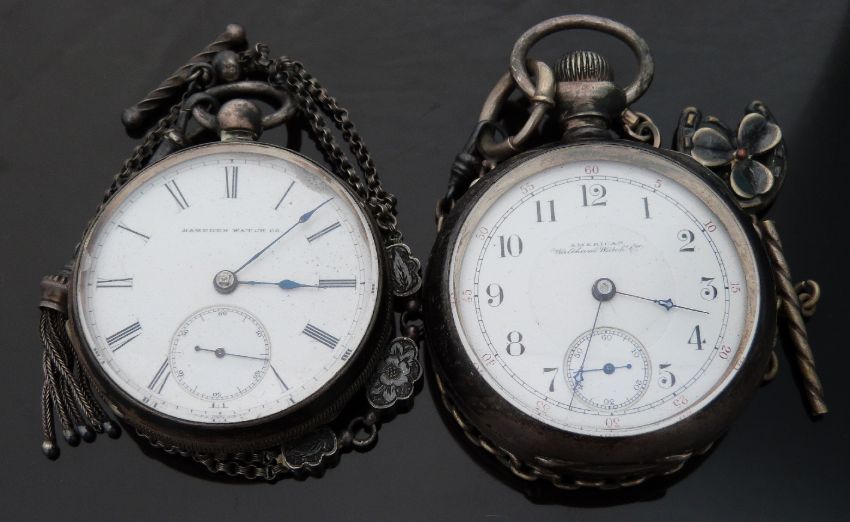 Two American open faced pocket watches one by Waltham with Arabic numerals, inset subsidiary seconds dial and blued hands, the other by Hampden Watch Co with inset subsidiary seconds dial, blued hands and Roman numerals, both on ornate white metal chains.