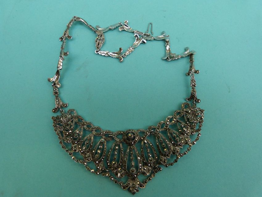 A silver necklace set with marcasite, marcastite earrings and bracelet, a white metal pendant marked 800 set with marcasite etc