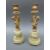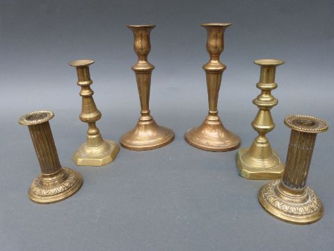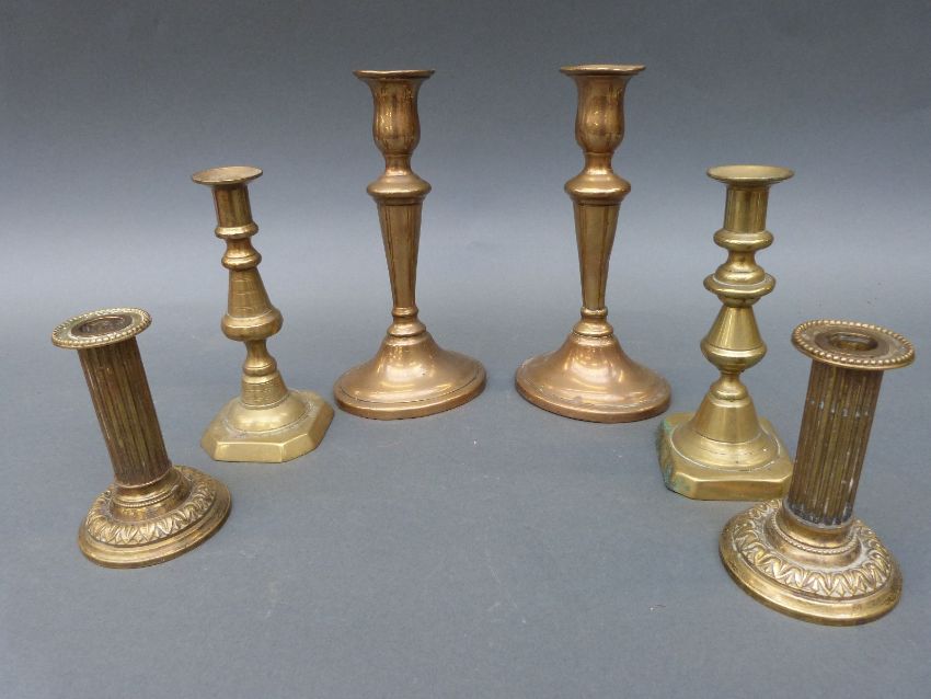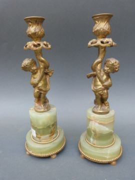 A pair of gilt candlesticks with putti on alabaster bases together with three pairs of brass candle sticks, height 30cm