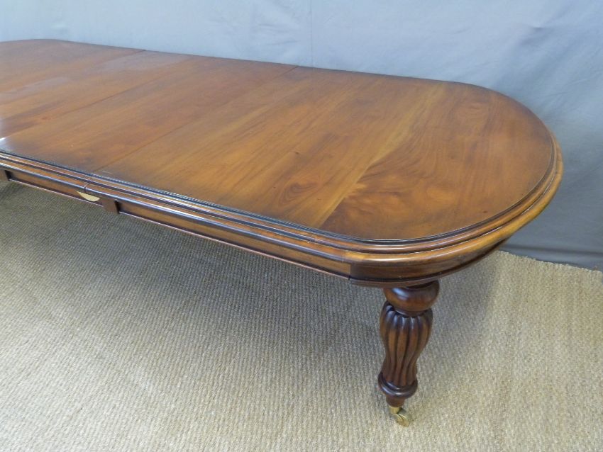 A Victorian style reproduction extending dining table raised on brass castors, length min 211, max 300, W124 x H80cm