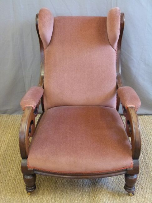 A Victorian mahogany wing back chair with scrolling pierced arms, turned front legs and sabre back legs raised on ceramic castors.