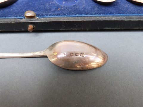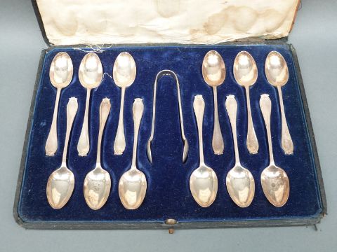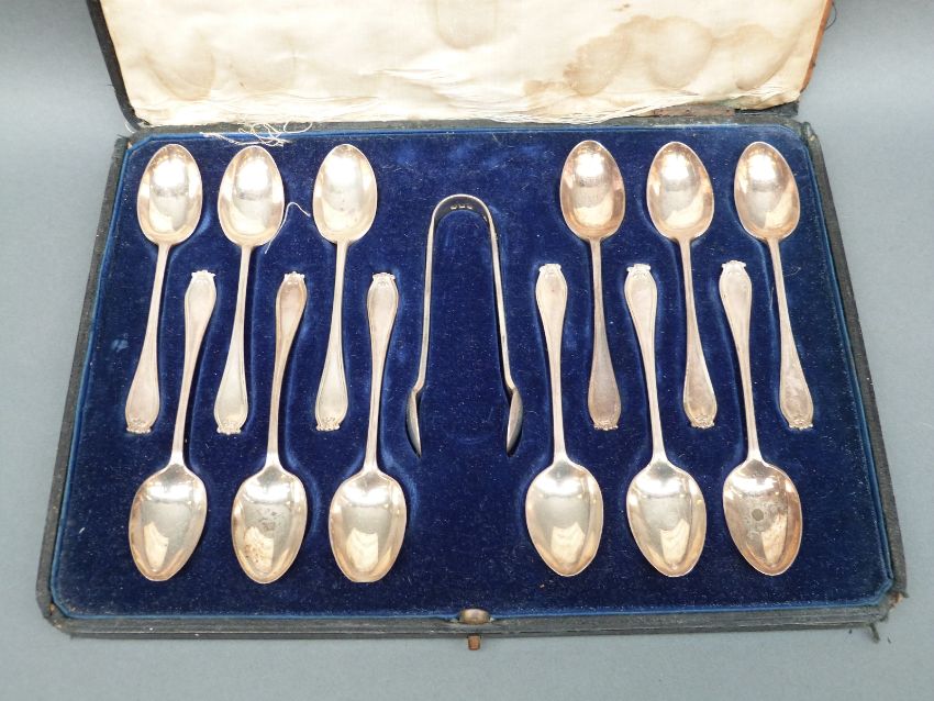 A Harrods cased set of 12 hallmarked silver teaspoons and tongs, weight 220g