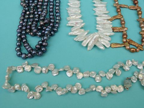 Nine pearl necklaces including freshwater pearls in different colours including some extremely long examples