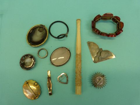 An agate bracelet, Victorian mourning brooches, agate, silver and filigree brooches, carved bone cheroot holder etc