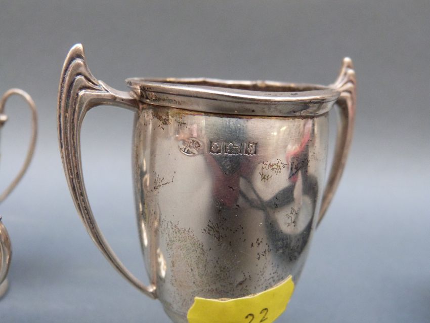 Five small or miniature hallmarked silver twin handled trophy cups, largest height 9cm, weight of all 120g