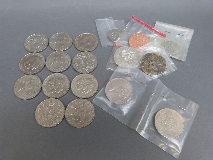 A tin of modern crowns and fifty pence pieces, including Battle of Britain