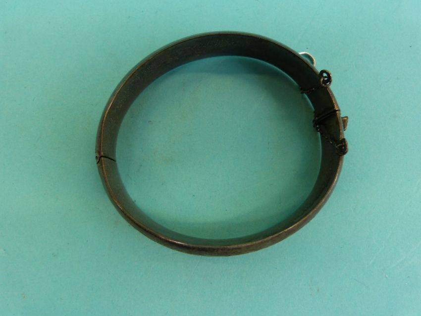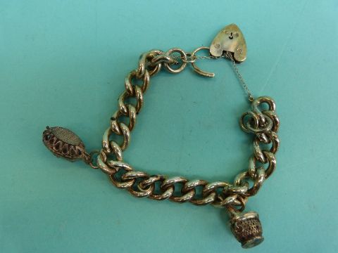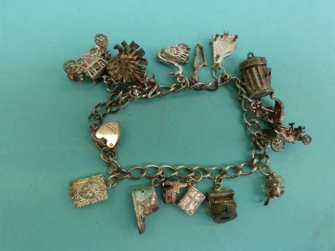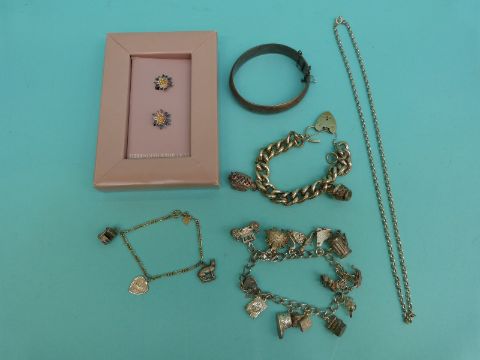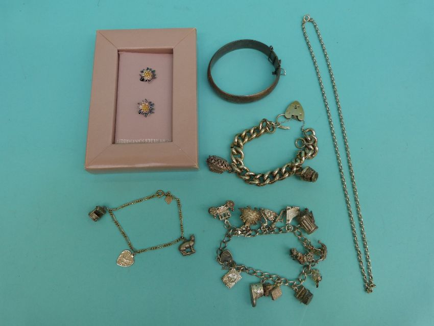 A silver charm bracelet, a silver curb link bracelet, a hallmarked silver bangle etc