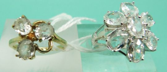 A 9ct white gold ring set with clear gemstones in a cluster and a 9ct gold ring set with paste