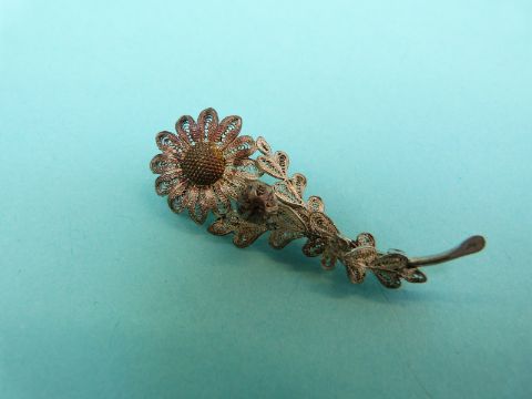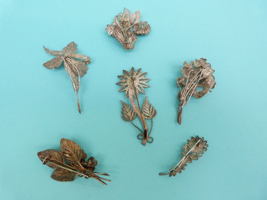 Six white metal filigree brooches, all in the form of flowers, some marked 800