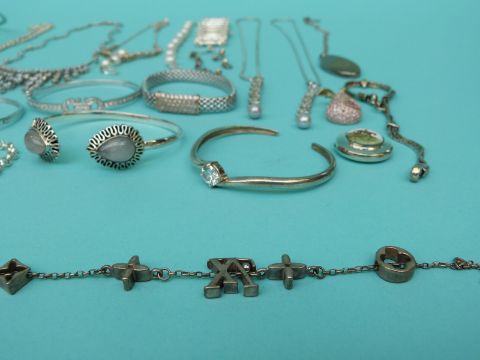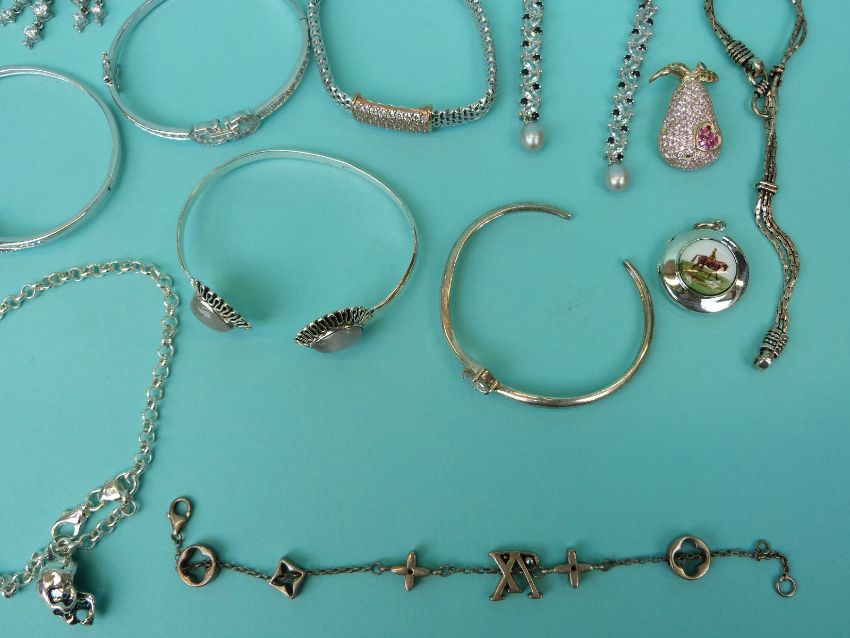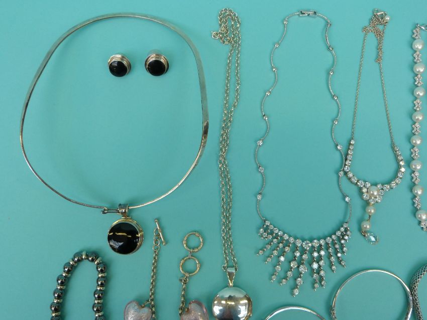 A collection of silver to include bangles, some set with cubic zirconia, a suite of silver jewellery, a necklace set with crystal, silver, pearl and crystal necklace, locket, sapphire and pearl necklace, pearl bracelet etc