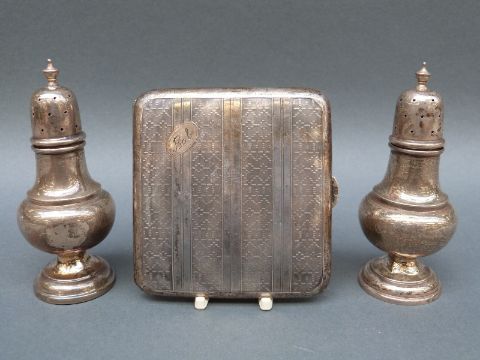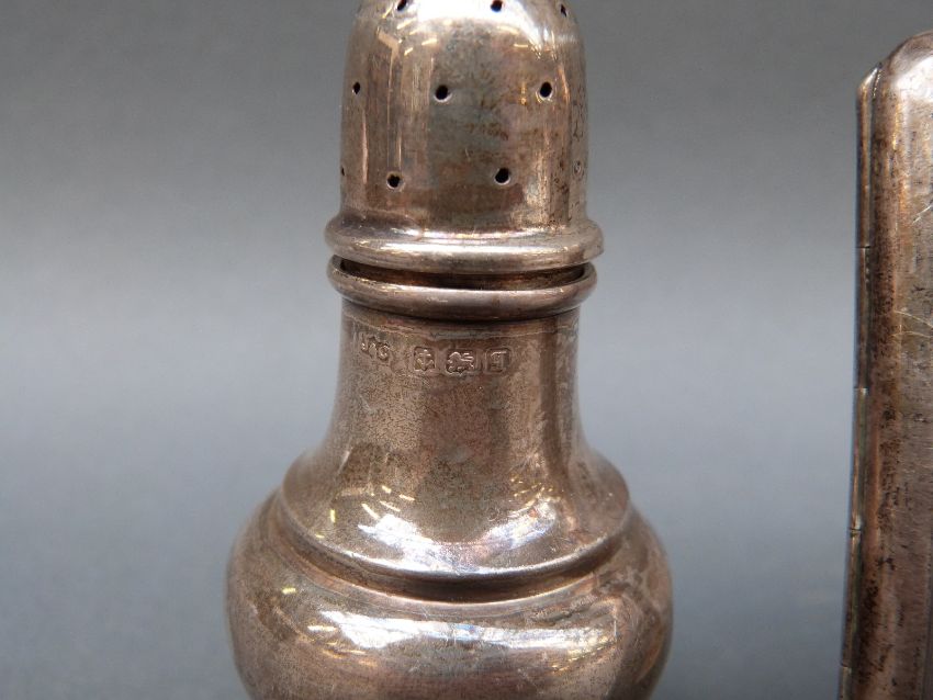 A pair of George V hallmarked silver peppers, Birmingham 1915 maker Jones & Crompton, height 10cm, weight 53g together with a white metal cigarette case marked 0800, weight 76g