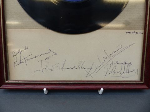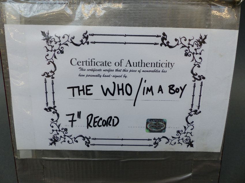 A framed 'I'm A Boy' 45rpm by The Who on the Reaction label with a signed card.