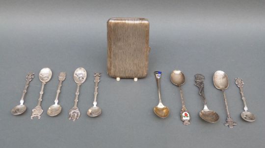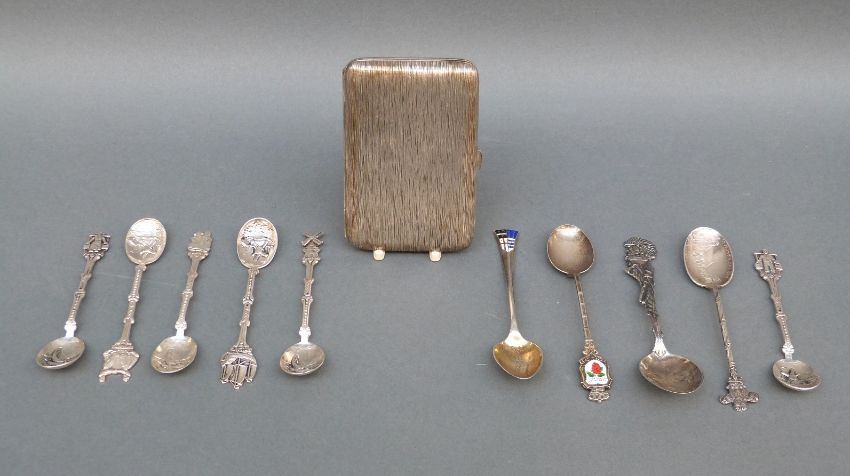 A continental white metal bark effect cigarette case together with a quantity of hallmarked silver and white metal spoon, weight 108g, and a boxed set of six continental plated spoons