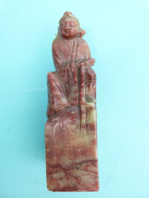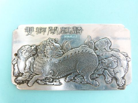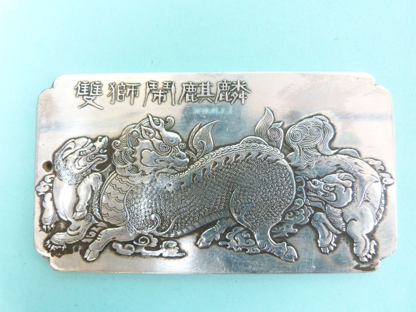 A Chinese white metal plaque/pendant with dog of fo decoration, hallmarked silver bracelets, shagreen case and a soapstone scroll weight