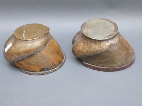 Two silver plated mounted horse hoof ink wells, one named Major and dated 1897