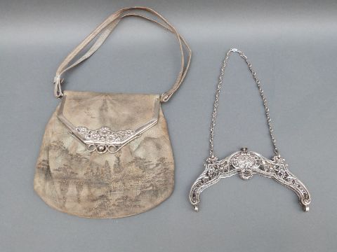 A white metal bag mount marked sterling, width 16cm together with a similar style bag