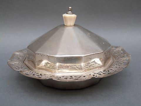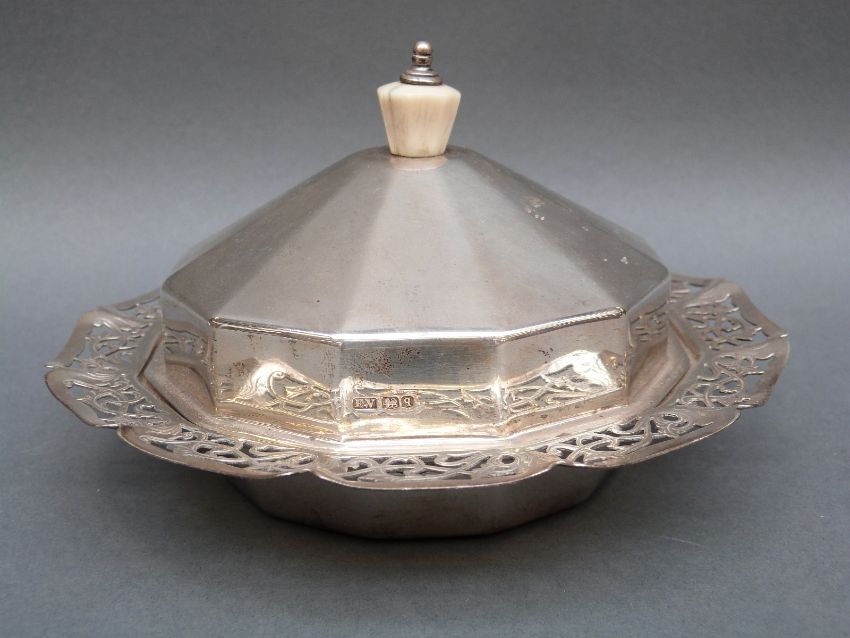 An Art Deco hallmarked silver butter dish with glass liner, the base having pierced decoration, Sheffield 1933, weight without liner 285g, diameter 16cm